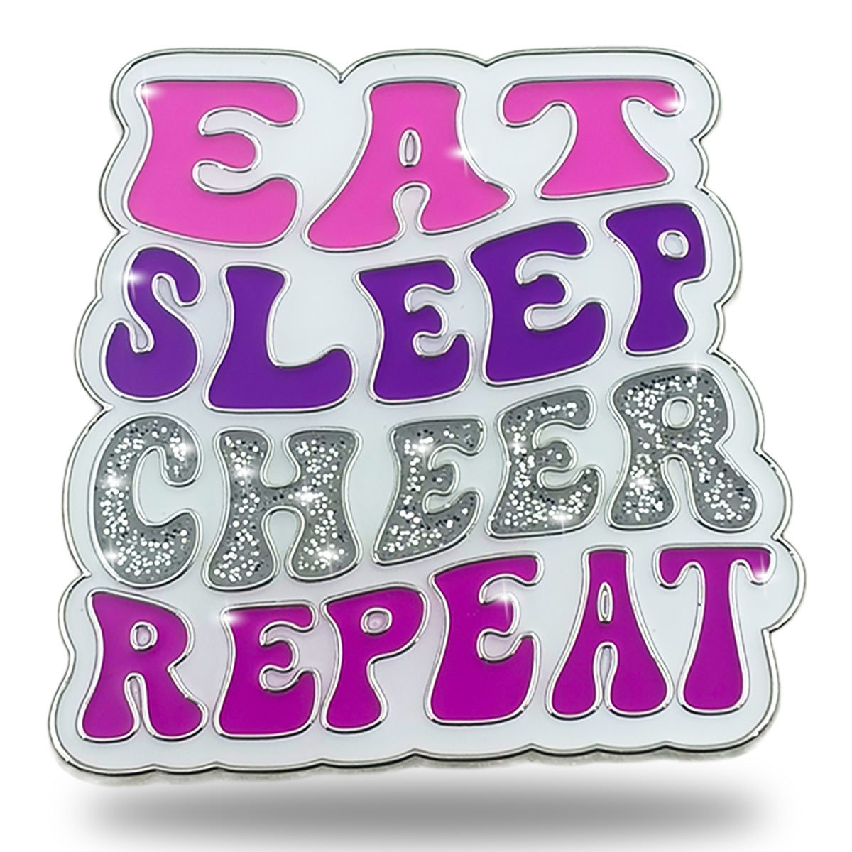 This trendy, EAT SLEEP CHEER REPEAT enamel pin pops with vibrant pink and purple enamel, and a sparkling silver glitter "CHEER" center. It is the ultimate statement piece for the athlete who knows this isn't just a sport, it's a 24/7 lifestyle. The extra large size makes it great for cheer bags!