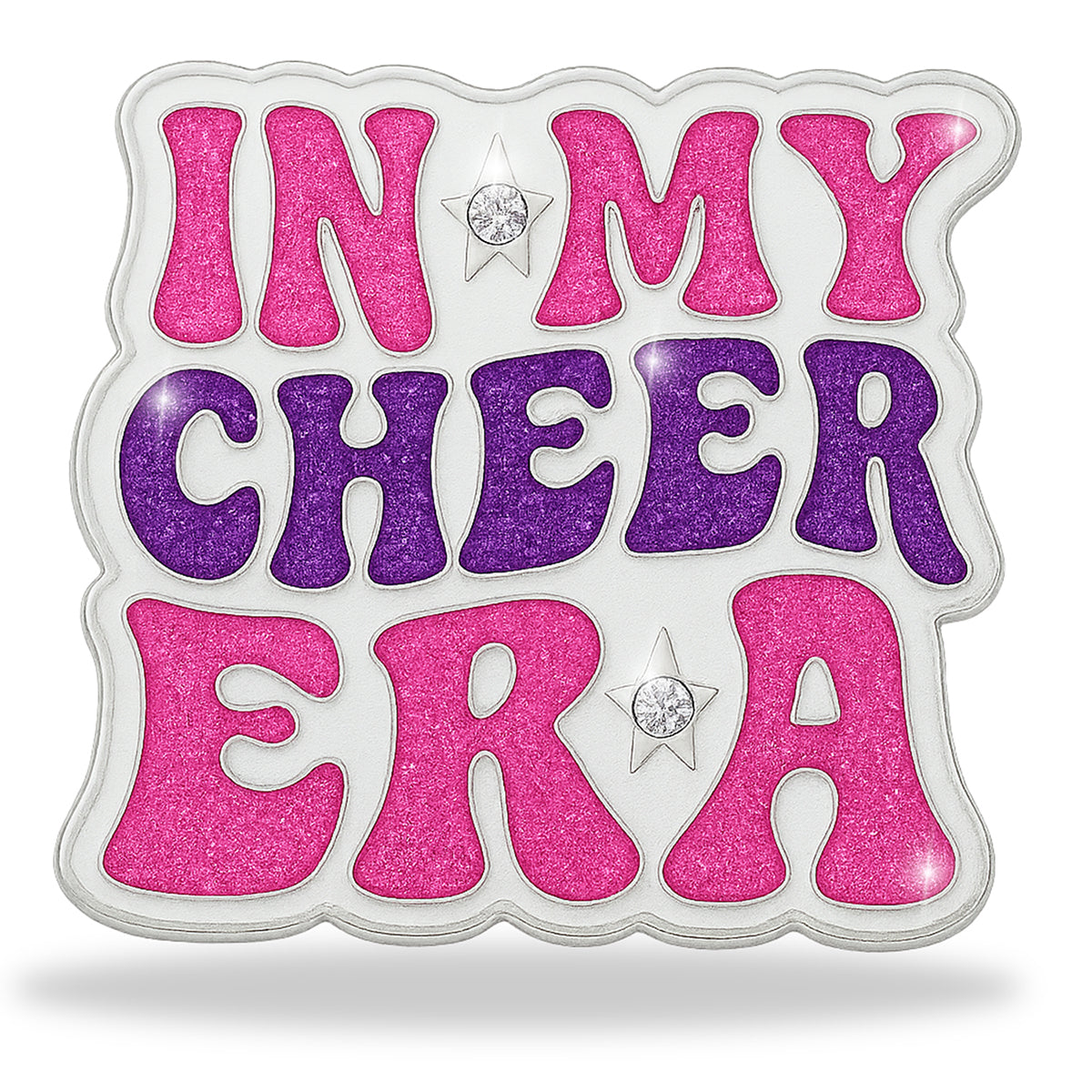 Show off your passion with this IN MY CHEER ERA enamel pin. This extra-large statement pin features sparkling pink and purple glitter lettering on a polished silver and white base. With two dazzling faux diamond stars embedded in the design, it is the perfect way to celebrate your love for the sport and shine from the stands to the mat.